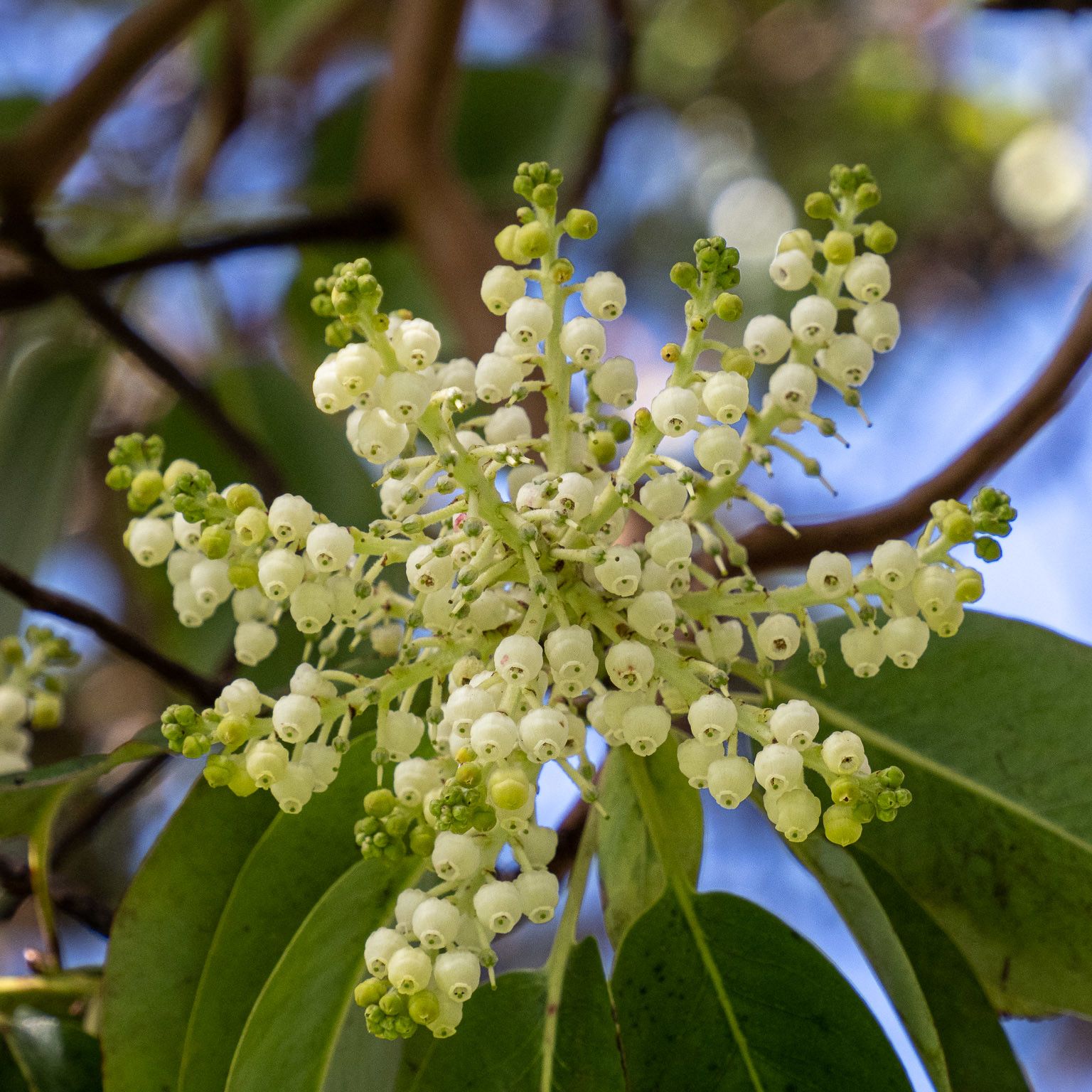 Clusters of small, bell-shaped white flowers droop from the end of stems in April/May. They smell strongly of honey, making them very attractive to bees. They may also be a source of nectar for hummingbirds.