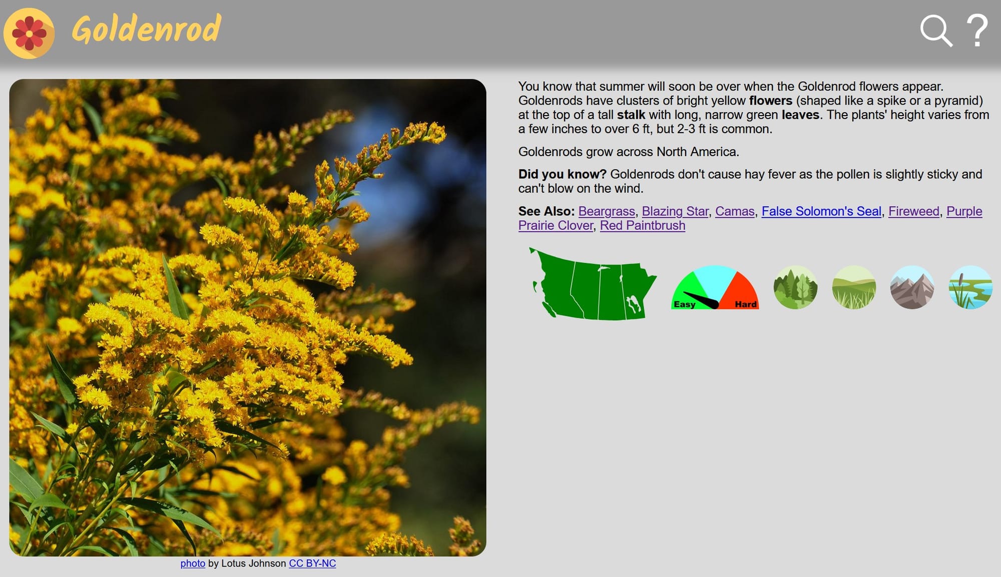 Goldenrods vary in height from a few inches to 1.8 m. They don't cause hay fever as the pollen is slightly sticky and can't blow on the wind. (Nature Companion is a free app/website introducing many of the plants and animals found in Canada’s four western provinces.)