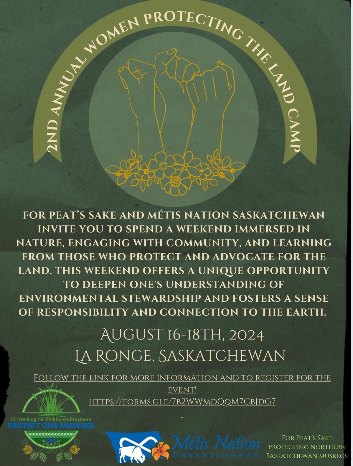 Saskatchewan - For Peat's Sake is hosting the Women's Protecting the Land Camp, Aug. 16-18, to inspire and empower women to reclaim our power to protect the land. Topics will include water in Northern Saskatchewan, muskeg, and plant knowledge/medicine walks. Register by Aug. 1.