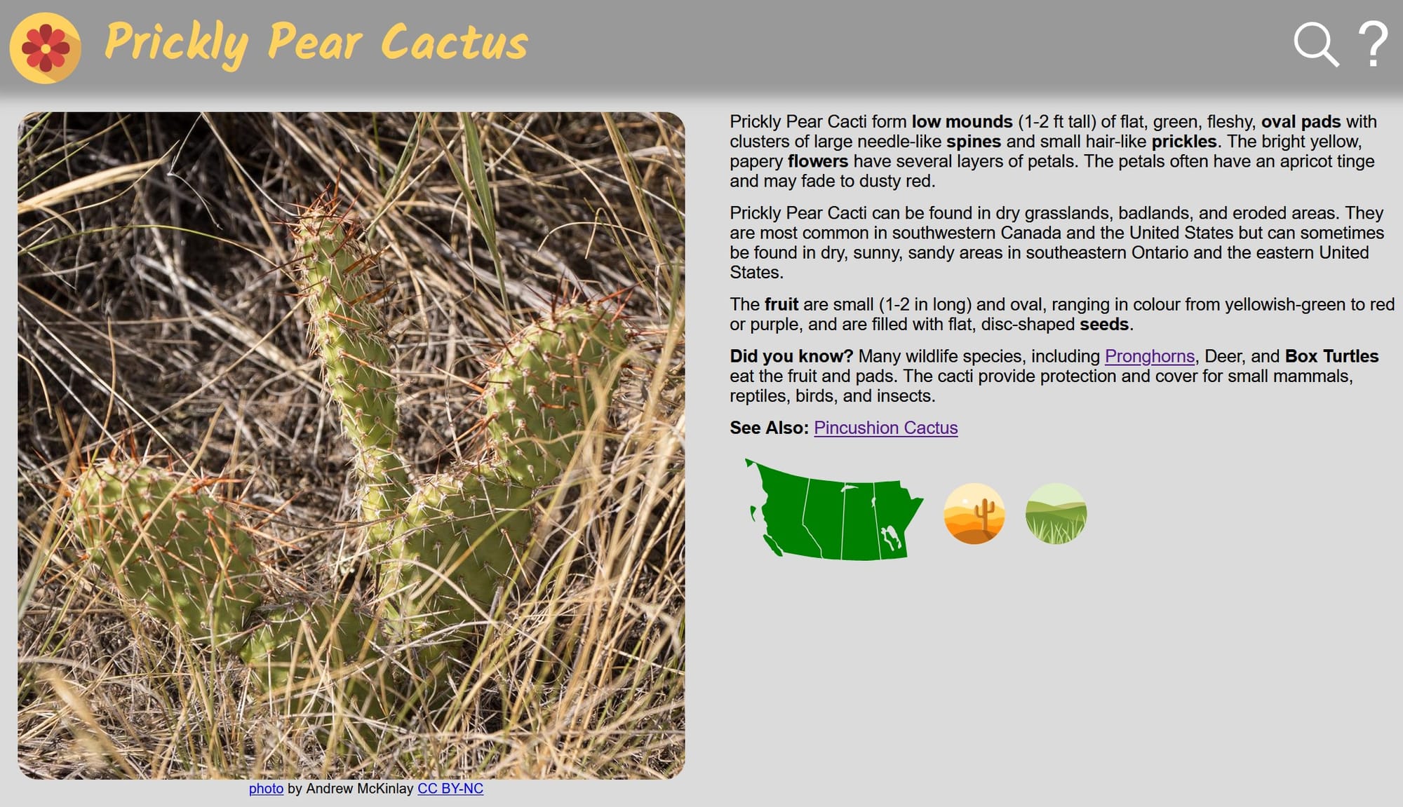 Prickly Pear Cacti provide protection and cover for small mammals, reptiles, birds, and insects. Many animals eat the fruit and pads. (Nature Companion is a free app/website introducing many of the plants and animals found in Canada’s four western provinces.)