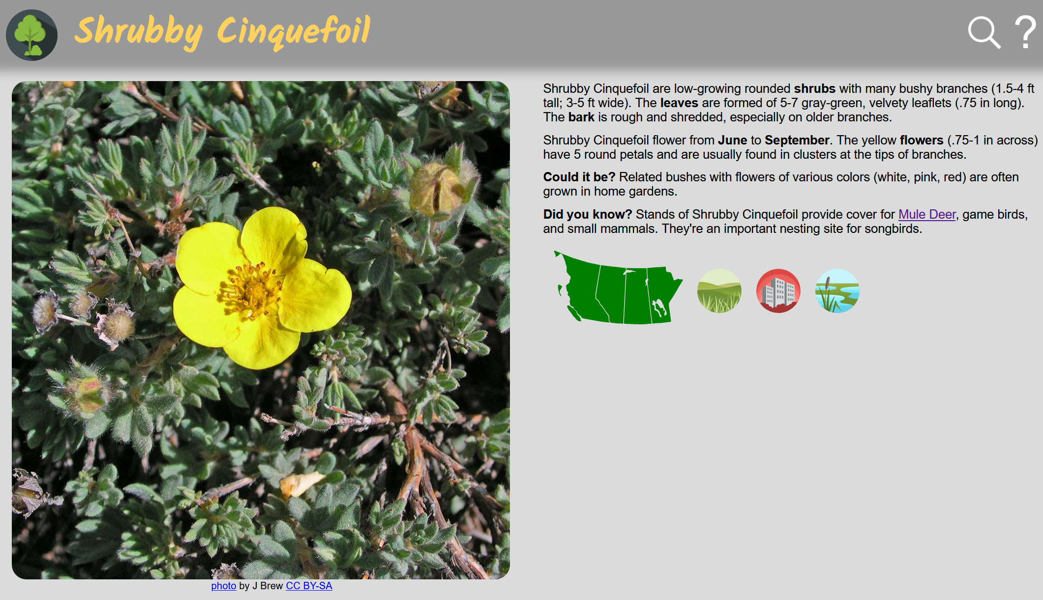 Stands of Shrubby Cinquefoil provide cover for mule deer, game birds, and small mammals and are an important nesting site for songbirds. (Nature Companion is a free app/website introducing many of the plants and animals found in Canada’s four western provinces.