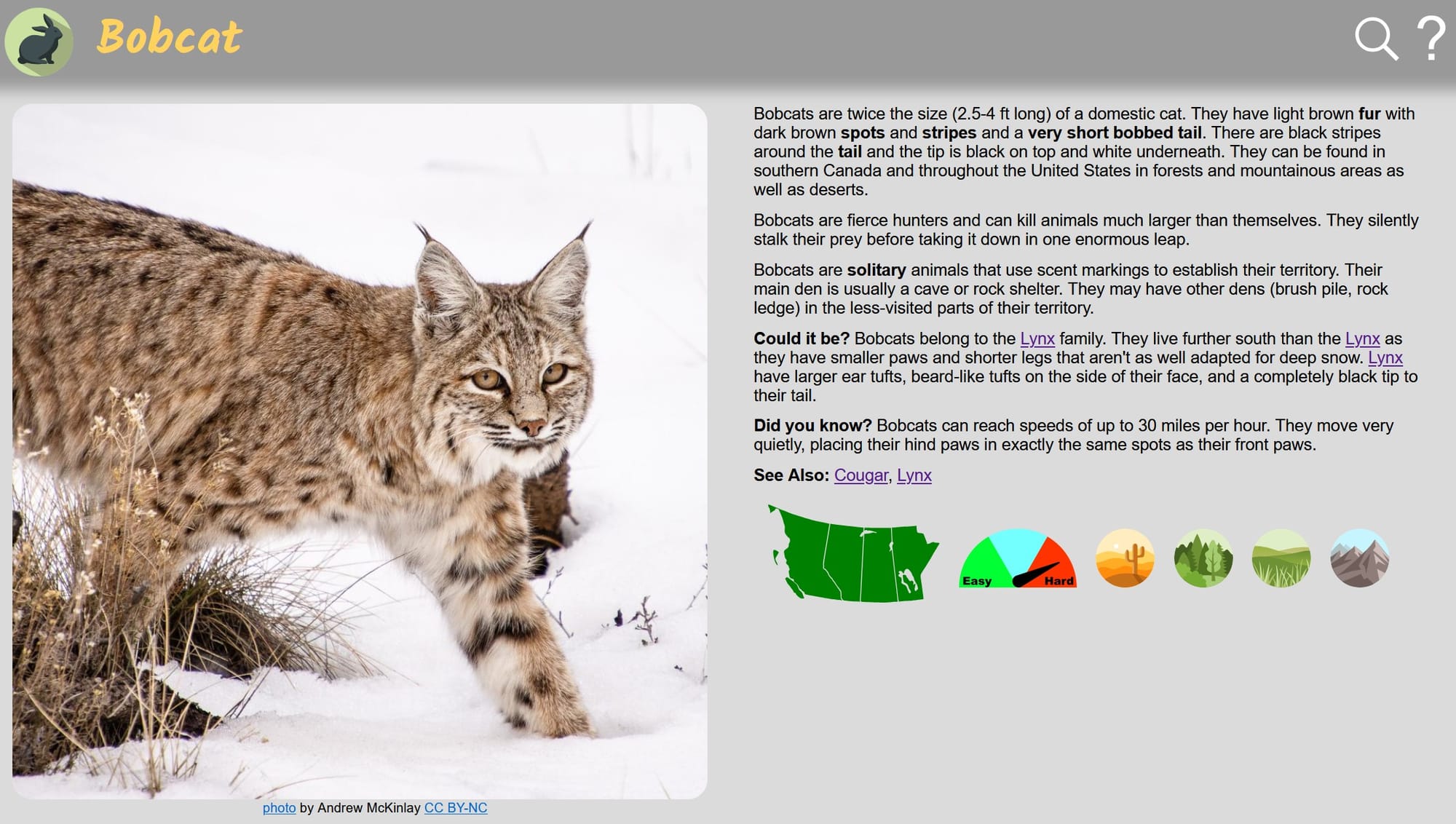 Bobcats are solitary animals. They move very quietly, placing their hind paws in exactly the same spots as their front paws. (Nature Companion is a free app/website introducing many of the plants and animals found in Canada’s four western provinces.)