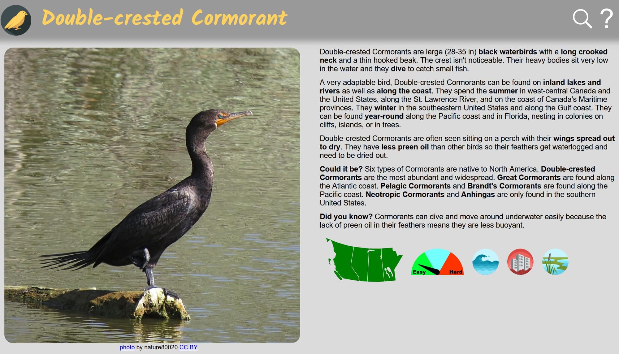 Double-crested Cormorants are often seen sitting on a perch with their wings spread out to dry. They have less preen oil than other birds so their feathers get waterlogged. (Nature Companion is a free app/website introducing many of the plants and animals found in Canada’s four western provinces.)