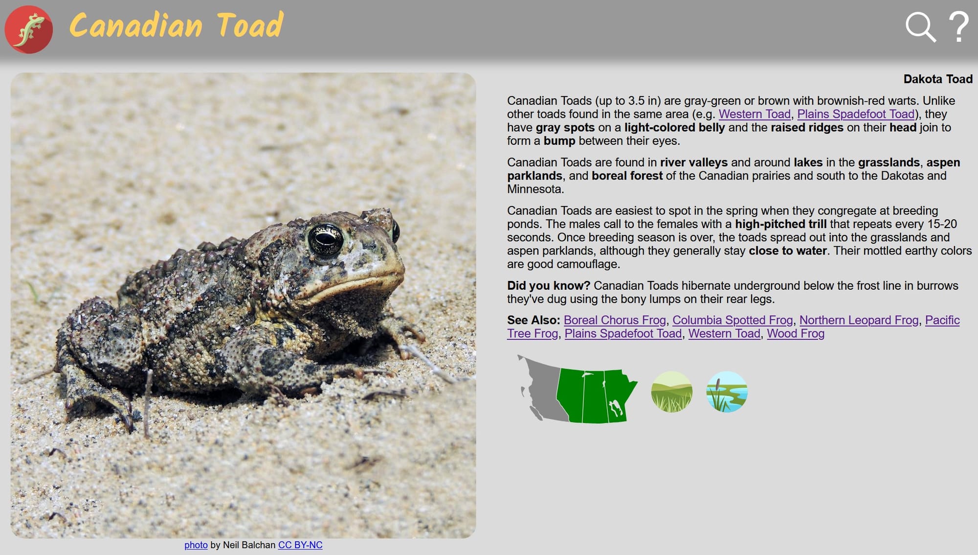 Canadian Toads hibernate underground below the frost line in burrows they've dug using the bony lumps on their rear legs. (Nature Companion is a free app/website introducing many of the plants and animals found in Canada’s four western provinces.)