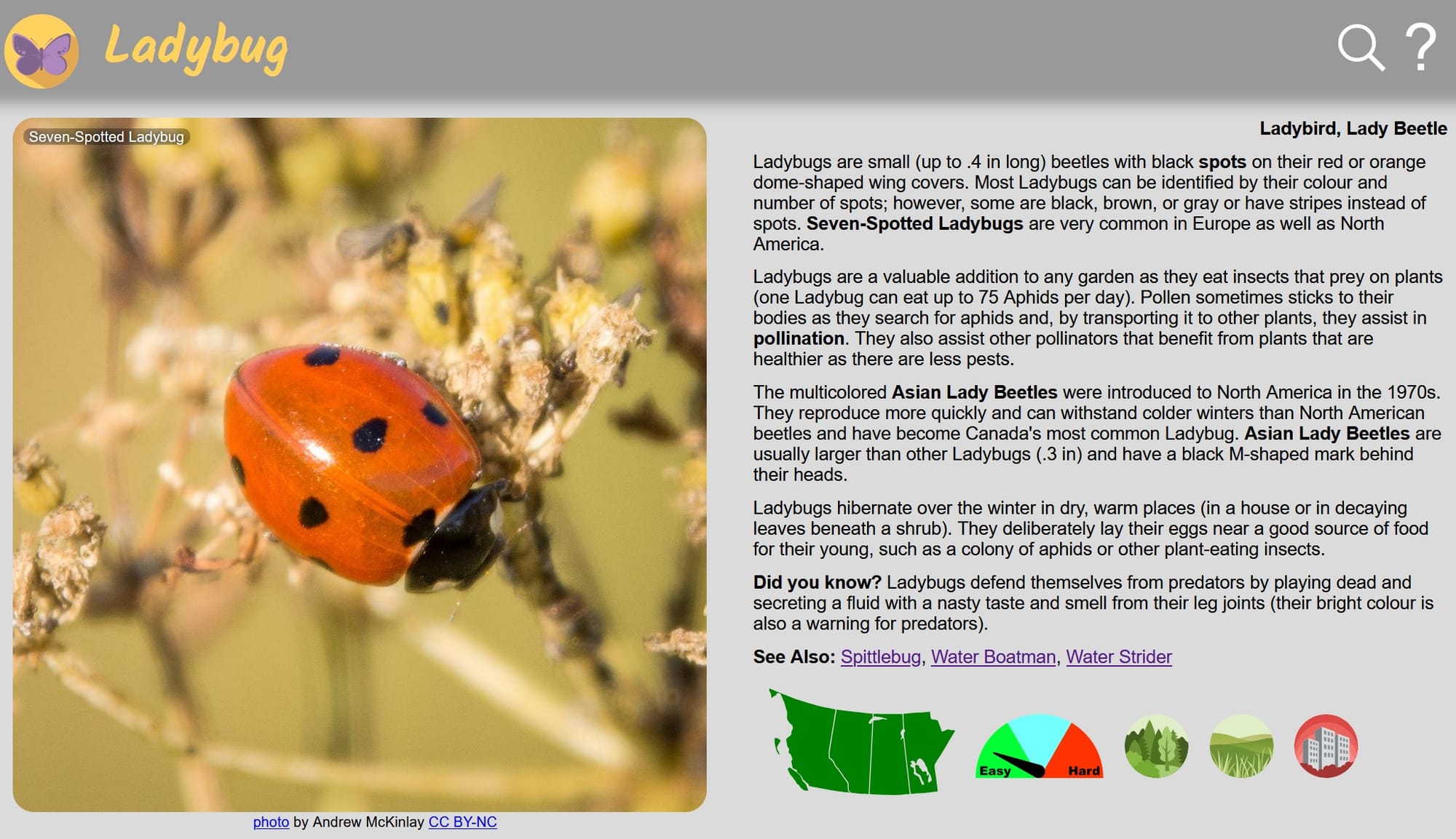 Ladybugs defend themselves from predators by playing dead and secreting a fluid with a nasty taste and smell from their leg joints. (Nature Companion is a free app/website introducing many of the plants and animals found in Canada’s four western provinces.)
