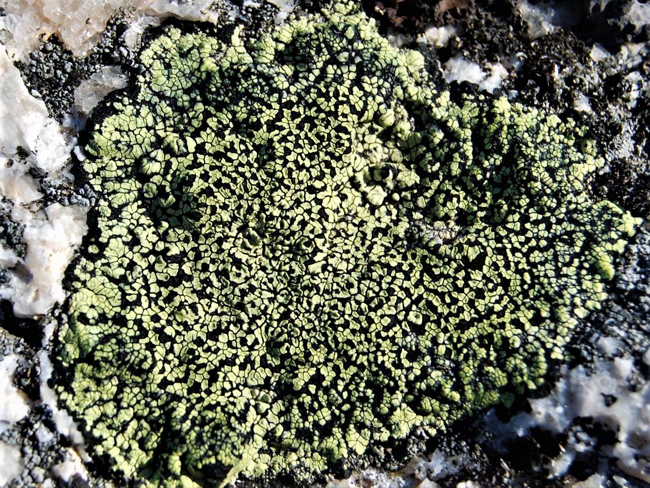 Crustose lichens form a crust on the surface of bark, rock, soil, car, or roof tile and are often brightly coloured. They grow directly into the substrate and can’t be separated. Many of them grow in the Arctic, but they are found throughout Canada. Yellow map lichen (pictured below) is widespread across the country.
