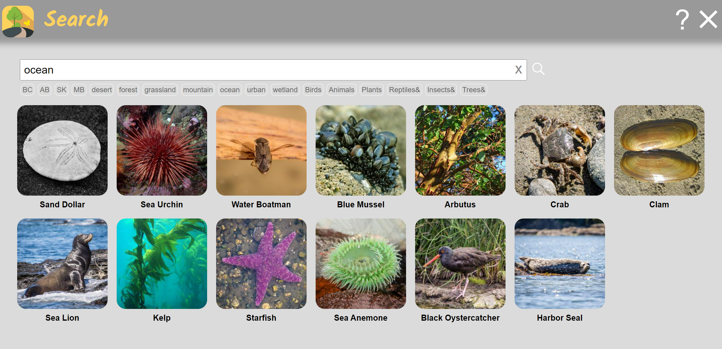 Tip: Heading to the BC coast? Why not see how many shoreline animals and plants you can spot by searching on “ocean’’.