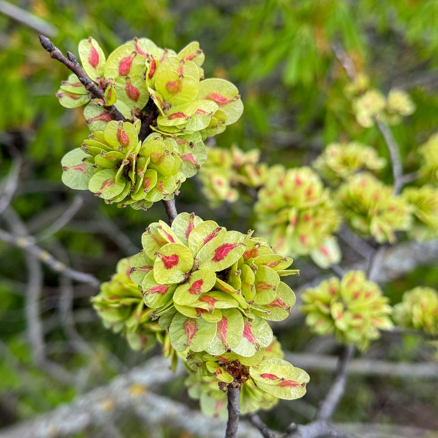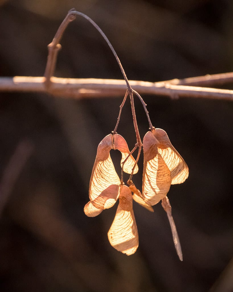 Like helicopter blades, the seeds of Manitoba maples (box elder) spin in the wind, carrying them further than they would otherwise. Both a male, pollen-producing tree and a female, egg-producing tree are required for pollination. Once pollination occurs, the eggs develop into two inward-facing wings that are attached at the base with each wing containing a single seed. The seeds are an important food source for many small animals and birds.