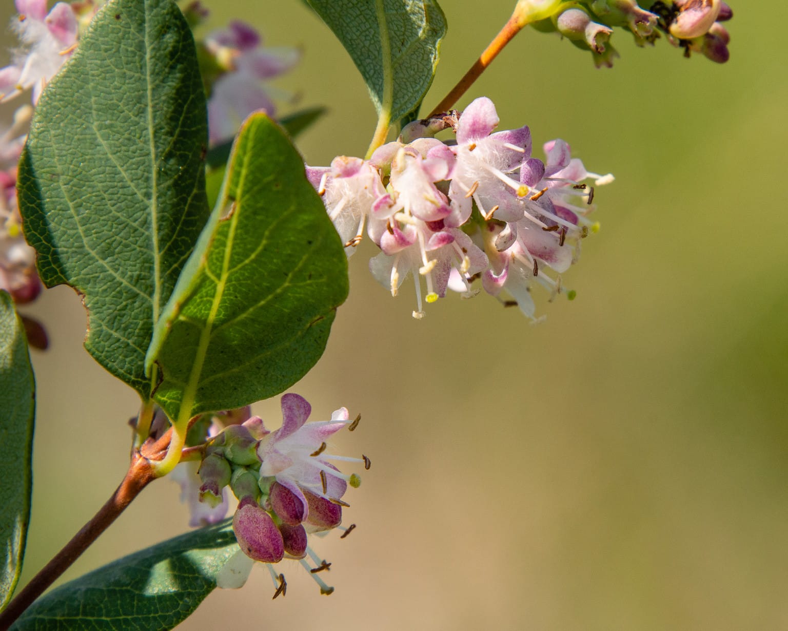 Snowberry bushes have clusters of white, waxy berries that remain on the shrub and are easy to spot in winter. The clusters of small, pinkish-white, bell-shaped flowers are less conspicuous, but their nectar is popular with bees, hummingbirds, and insects. Once pollinated, the flowers develop into berries with two nutlets (seeds with a stony layer). You’ll often find clusters of snowberry bushes as they usually reproduce by sending out underground stems called rhizomes. Like many other berries, they only rarely reproduce from seed.