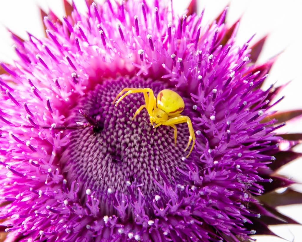 Crab spiders are somewhat contradictory pollinators. They pick up pollen when they move from one flower to another, sipping nectar and searching for a mate to pair with. They eat insects and larvae that would otherwise damage the plants, but they also deter or kill and eat other potential pollinators, such as bees and flies.