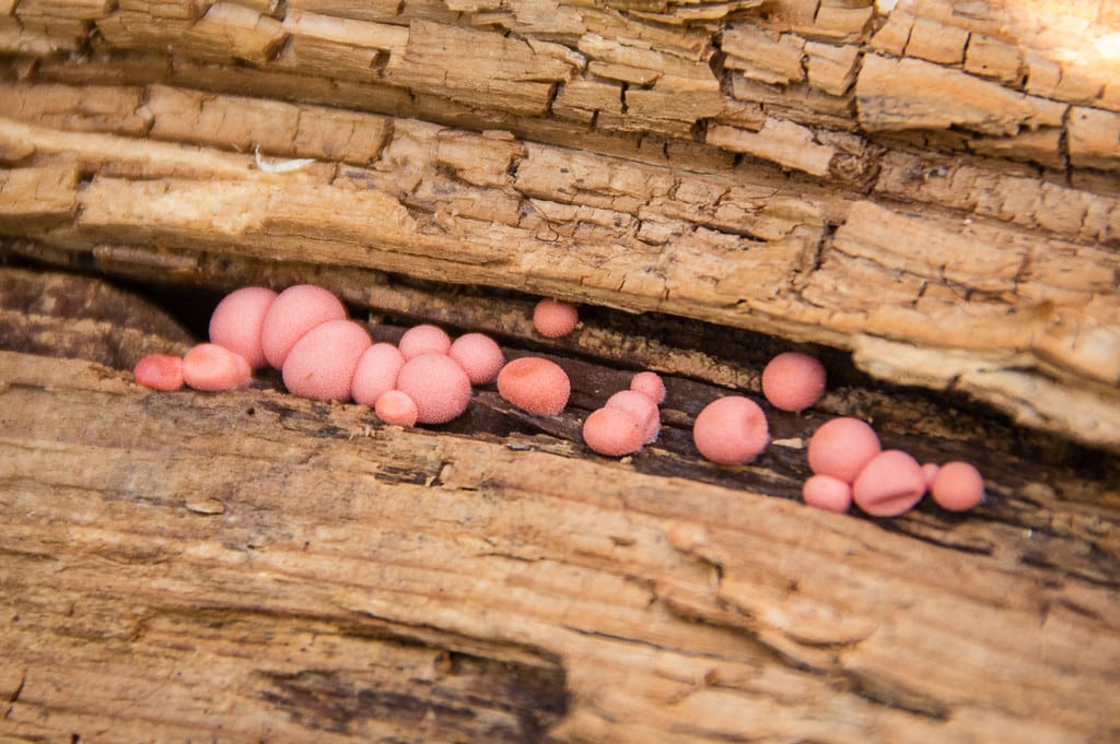 Wolf’s milk slime mould (lycogala epidendrum) forms small pink or brown cushion-like blobs that are scattered or in groups on rotting wood. The immature fruiting bodies are filled with a pink paste-like fluid (hence the mould’s alternate name of toothpaste slime) that ripens into a powdery mass of tiny grey spores.